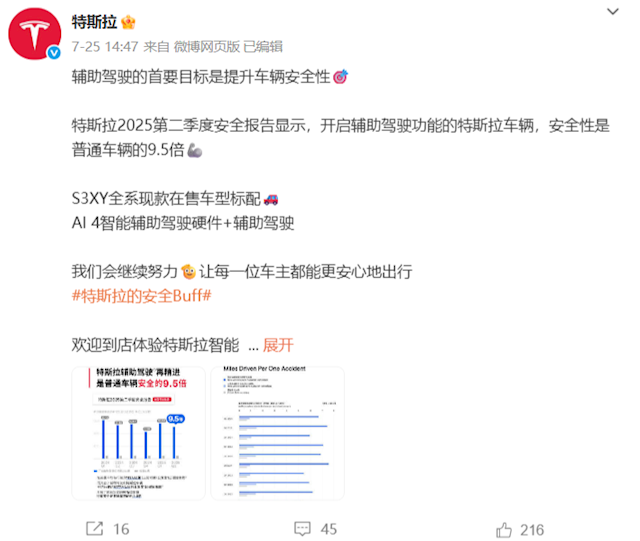 快科技7月28日消息,近日,懂车帝实测36款车辅助驾驶,结果引发极大争议。表现最好的特斯拉回应称,特斯拉2025第二季度安全报告显示,开启辅助驾驶功能的特斯拉车辆,安全性是普通车辆的9.5倍安全。