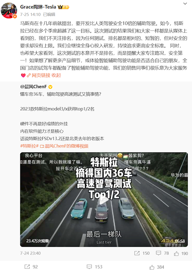 如今,特斯拉已经在多个季度超越了这一目标。这次测试的结果我们和大家一样都是从媒体上看到的,我们不关注排名,因为任何测试、排名都是相对的、短暂的,但对安全的要求却没有上限。我们会继续全身心投入研发,持续追求更高安全标准。